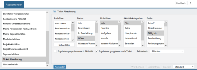 | Modulaktivitäten | Die Auswertung Modulaktivitäten ermöglicht Ihnen die Erstellung einer Liste, die Ihnen die Verknüpfungen ausgehend von den Modulen Kontakte, Projekte oder Tickets zu ausgewählten Aktivitäten wie Termine, Aufgaben, Anrufe, Notizen, externen und internen Aktionen anzeigt. Zusätzlich können Sie die Liste, sowohl nach Kategorien und Abteilung eingrenzen als auch eigene Filterabfragen kreieren. |