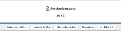 | Öffnet die Datei im internen Editor, sofern für die Dateiart (z.B. doc, docx, xls, xlsx etc.) ein internes und ein externes Programm zur Verfügung stehen. Andernfalls fehlt dieser Button und es erfolgt ein direkter Download. In der geöffneten E-Mail erscheint der Button erst, wenn Sie auf die Anlage einen Doppelklick ausführen.