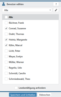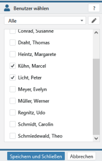 | Nutzen Sie die Möglichkeit, das Dokument einem Benutzer zuzuordnen, öffnet sich ein Auswahlfenster Ihrer Kollegen. Wählen Sie die gewünschten Kollegen aus und bestätigen Sie durch . Das Dokument wird in die eigenen Dokumente in den Ordner Eingang der ausgewählten Personen kopiert. | |||