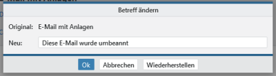 Wurde die Option Betreff änderbar im Administrationsmenü aktiviert, ist es möglich, den Betreff einer empfangenen bzw. gespeicherten E-Mail direkt zu editieren. Klicken Sie dazu mit der rechten Maustaste auf die E-Mail und wählen Sie im Kontextmenü . Tragen Sie in das erscheinende Dialogfeld den neuen Betreff der E-Mail ein und bestätigen Sie die Änderung mit . Der geänderte Betreff wird nur im TecArt CRM gespeichert und angezeigt. In einem IMAP-Konto außerhalb des TecArt CRM bleibt der ursprüngliche Betreff.