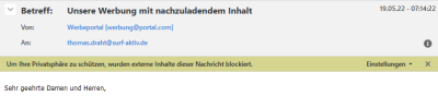- Als zusätzlichen Schutz empfiehlt es sich, Spam-Mails gar nicht erst zu öffnen. Durch das Öffnen kann dem Absender bestätigt werden, dass die E-Mail-Adresse noch benutzt wird.