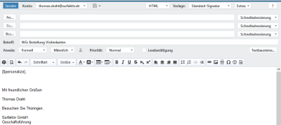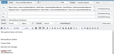 Bei Bedarf können Sie auch eine weitere Vorlage auswählen, wenn die E-Mail nicht mit Ihrer Standard-Signatur versandt werden soll.