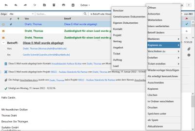 Eingegangene oder versendete E-Mails können Sie jederzeit zu einem Benutzer oder einem anderen Modul verschieben oder kopieren. Dies sollten Sie von Zeit zu Zeit für die Pflege eines guten Kundenkontakts oder einer guten Projektpflege tun, wenn Sie keine automatischen E-Mail-Filter eingerichtet haben. Unabhängig von E-Mail-Filtern können Sie E-Mails aber auch themenbezogen zu jedem anderen Objekt kopieren/verschieben.
