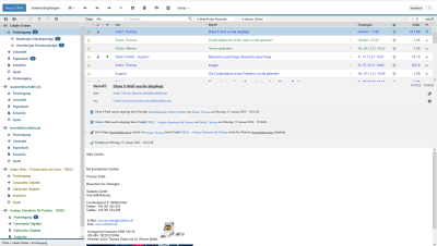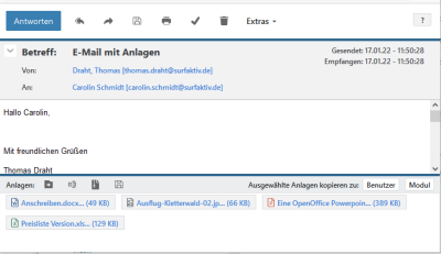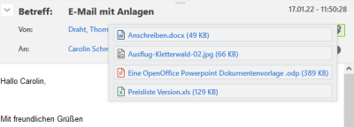 Um Anhänge in E-Mails zu öffnen oder zu speichern, stehen Ihnen zwei Möglichkeiten zur Verfügung. In der Vorschau der E-Mails im unteren Fensterbereich, werden Ihnen neben den E-Mail-Details, auch die Anhänge in Form einer Büroklammer auf der rechten Seite angezeigt. Des Weiteren finden Sie die Anhänge von empfangenen E-Mails im unteren Bereich einer geöffneten E-Mail.