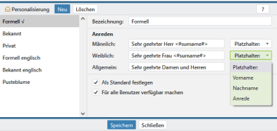 Eigene Personalisierungen können Sie über das Menü > bearbeiten oder erstellen. Administratoren haben darüber hinaus die Möglichkeit, eine Anrede für alle Benutzer verfügbar zu machen.