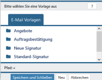 Wie die Signaturvorlagen eines E-Mail-Kontos, können auch beliebige E-Mail-Vorlagen erstellt werden. Diese werden über die E-Mail-Vorlagen verwaltet und können auch variable Angaben enthalten. Speichern Sie die E-Mail als Vorlage ab, so werden Sie im nachfolgenden Schritt nach dem Speicherort gefragt.