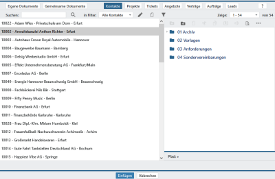 | Möchten Sie das Dokument einem anderen Modul zuordnen, nutzen Sie diesen Button. Daraufhin wird Ihnen die Suche für die von Ihnen nutzbaren Module angezeigt. Filtern Sie anhand der Suchmöglichkeiten und Ihrer Filter das gewünschte Objekt heraus und markieren Sie das entsprechende Objekt. Nach Bedarf können Sie neue Unterordner anlegen oder vorhandene Unterordner auswählen und ggf. einen neuen Dokumentennamen vergeben. Mit wird das ausgewählte Dokument im ausgewählten Ordner abgelegt. |