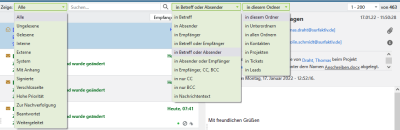 Um in Ihrem Postfach oder im TecArt CRM nach einer bestimmten E-Mail zu suchen, wählen Sie in der Symbolleiste den Bereich aus, der durchsucht werden soll. Grenzen Sie die Suche durch die entsprechenden Auswahlmöglichkeiten ein. Geben Sie einen Suchbegriff ein. Nun können Sie entweder die Suche mit Enter oder der Lupe starten.