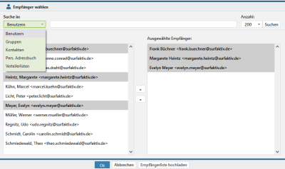 Bei Bedarf kann über das Fenster zur Auswahl der Empfänger auch eine Liste über den Button importiert werden. Als Listen sind CSV- oder TXT-Dateien möglich, welche je Zeile eine E-Mail-Adresse enthalten.