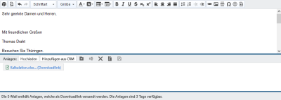 Fügen Sie nun grundlegend Ihre Anlagen an, auch wenn diese sehr groß sind. Alle Anlagen, die die in der Administration eingestellte Versandgröße überschreiten, werden ermittelt. Dabei wird bereits unter den Anlagen ein Hinweis eingeblendet.