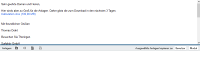 Sobald die E-Mail im Postausgang liegt können Sie Details der E-Mail sehen, wie diese beim Empfänger ankommt. Dabei stehen die übergroßen Anhänge als Downloadlink bereit und werden nicht mehr in den angefügten Anlagen angezeigt.