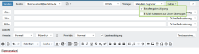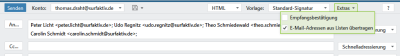 Für Ihre E-Mails können Sie nach Wahl Lese- bzw. Empfangsbestätigung anfordern. Eine Lesebestätigung können Sie direkt über das Feld Lesebestätigung anfordern. Das Feld Empfangsbestätigung finden Sie über den Button innerhalb der neuen E-Mail.