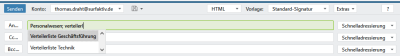 Um Verteilerlisten zu verwenden, gehen Sie genau so vor, wie beim Schreiben einer neuen E-Mail. Nutzen Sie dabei die automatische Vervollständigung der Adressen. Die Verteilerlisten oder Gruppen werden nur mit dem Namen angezeigt.