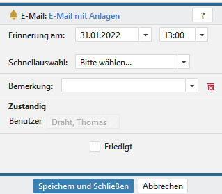 Wurde keine E-Mail-Adresse an einem Objekt gefunden oder ist die Auswahl nicht eindeutig, wird das zuletzt verwendete Objekt vorbelegt. Stimmt die Vorauswahl und Vorfilterung nicht, suchen Sie nach dem gewünschten Objekt.