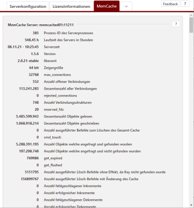Auf der Registerkarte MemCache werden interne Informationen über die Memcache-Komponenten aufgezeigt. Diese Daten stehen Ihnen in der Regel nur in TecArt-Server-Systemen zur Verfügung.