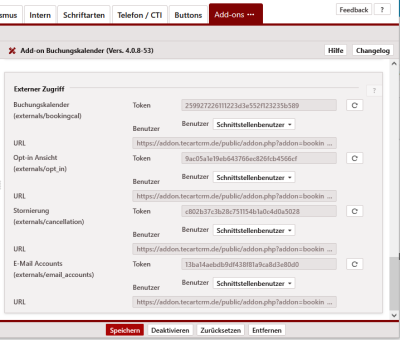 Im Abschnitt Externer Zugriff muss für die jeweiligen Abschnitte der Schnittstellenbenutzer ausgewählt werden, welcher für die Kommunikation zwischen dem Add-On und TecArt CRM zuständig ist, damit die Schnittstellen richtig bedient werden.