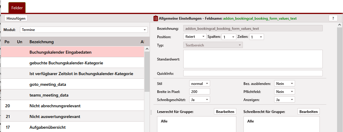 - Buchungskalender Eingabedaten (booking_form_values_text) – ist ein Textbereich, der für die Anzeige der im Buchungsformular übermittelten Daten verwendet wird. Auch für dieses Feld sollten Sie den Schreibschutz nicht verändern.