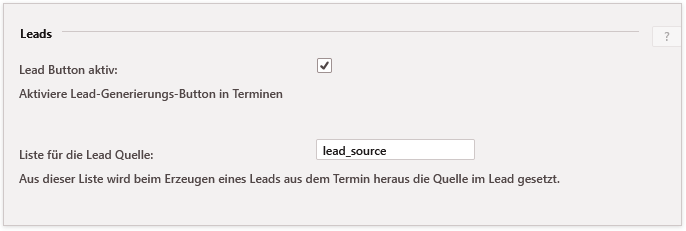 Für die Erstellung von Leads wird die Angabe einer Quelle benötigt. In der Regel wird die Liste lead_source hierfür verwendet. Diese kann in der Terminkategorie selbst dann eingestellt werden. Auswählbare Werte werden durch die hier angegebene Systemliste bereit gestellt.
