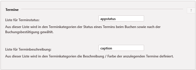 Reservierte und gebuchte Termine erhalten unterschiedliche Status vor und nach dem Opt-In. Die jeweiligen Werte können pro Terminkategorie eingestellt werden. Die Systemliste, welche die Auswahl bereit stellt, ist hier angegeben. Selbiges gilt für die Beschriftung/Farbe des anzulegenden Termins.