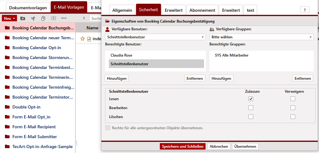 Stellen Sie für die E-Mail-Vorlagen des Buchungskalenders die erforderlichen Rechte ein. Achten Sie darauf, dass Sie die Berechtigung sowohl für den Ordner (E-Mail-Vorlage) und die darin befindlichen Dateien (Templates) einstellen müssen. Weiterhin kann es vorkommen, dass Sie aus anderen Ordnern Designs etc. integriert haben. Auch auf solche Designelemente benötigt der Schnittstellenbenutzer erforderliche Leserechte.