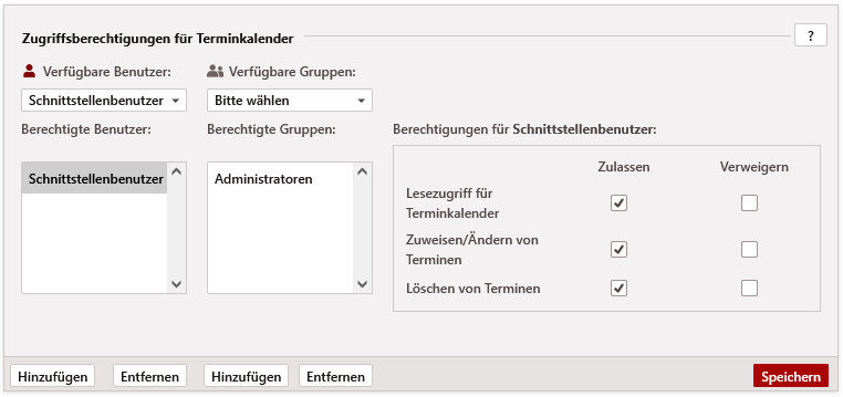 Als Administrator legen Sie die Berechtigung über die > > jeweiligen Benutzer auswählen > Termine ein. Fügen Sie den erforderlichen Schnittstellenbenutzer oder die erforderliche Gruppe hinzu und setzen Sie die Rechte Lesen, Bearbeiten und Löschen