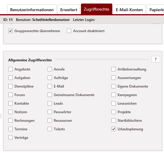 In diesem Modul genügt die Freischaltung des Moduls in den allgemeinen Zugriffsrechten. Gehen Sie hierzu auf > > jeweiligen Benutzer auswählen > Zugriffsrechte > Abschnitt Allgemeine Zugriffsrechte und prüfen Sie die Berechtigung des Schnittstellenbenutzers für das Modul Urlaubsplanung.