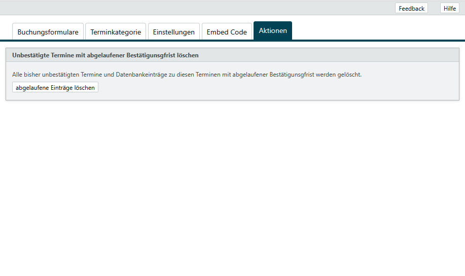 Auf der Registerkarte Aktionen haben Sie die Möglichkeit bisher unbestätigte Termine und Datenbankeinträge zu diesen unbestätigten Terminen mit abgelaufener Bestätigungsfrist über den Button {button txt=“abgelaufene Einträge löschen“] zu löschen.