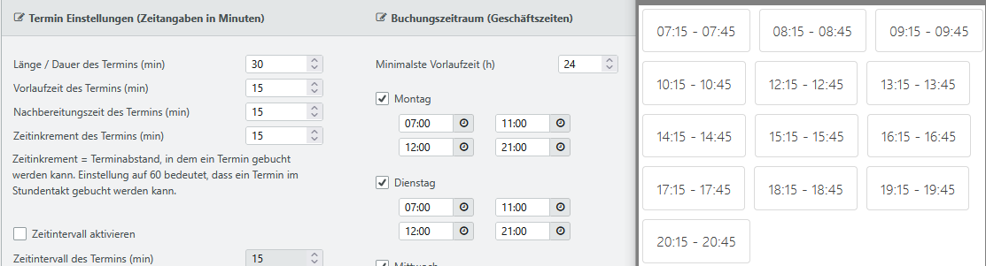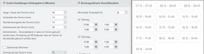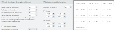 | Nachbearbeitungszeit des Termins (min) | Die Nachbearbeitungszeit nach einer Buchung in Minuten ist nicht Bestandteil des eigentlichen Zeitslots, sondern wird danach angehängt, um Zeit für die Nachbereitung des Termins zu erhalten. |