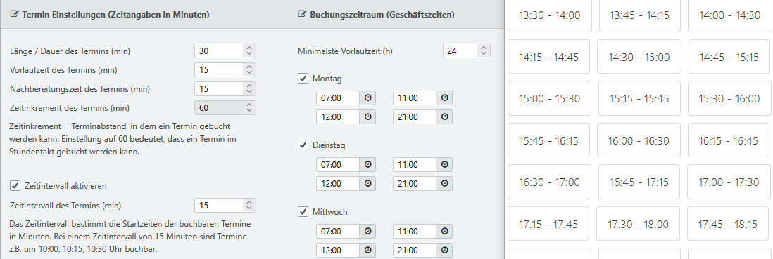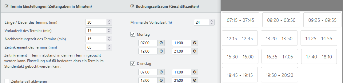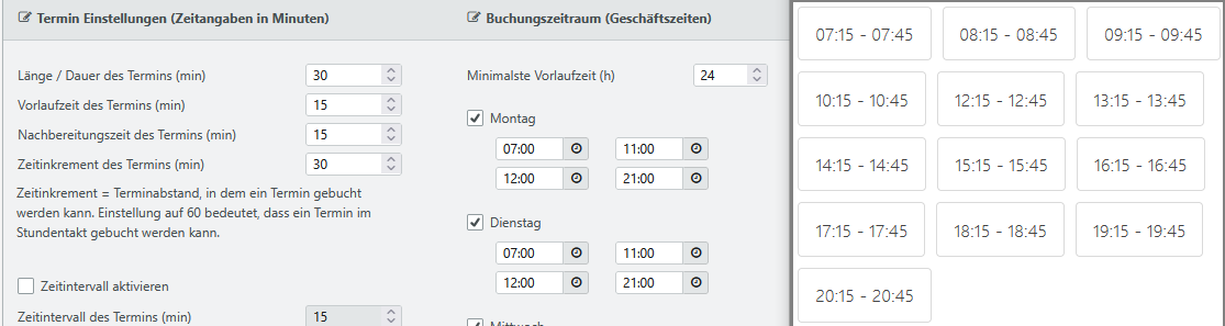Aktivieren Sie nun die Option Zeitintervall aktivieren wird automatisch der Zeitinkrement des Termins (min) deaktiviert. Weiterhin geben Sie nun einen Zeitintervall des Termins (min) in Minuten an, um feste Startzeiten vorzugeben.