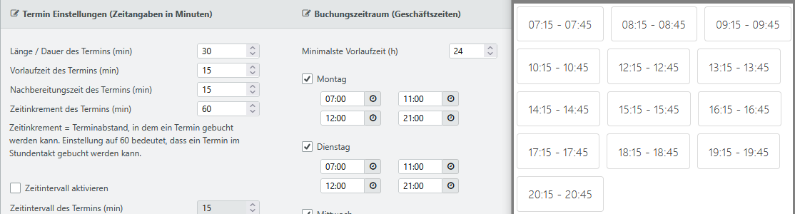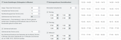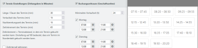 | Vorlaufzeit des Termins (min) | Die Vorbereitungszeit vor einer Buchung in Minuten (z.B. 15) ist nicht Bestandteil des eigentlichen Zeitslots, sondern wird davor angehängt. Dies bedeutet gleichzeitig, dass ein möglichere Termin direkt zuvor nicht gebucht werden kann. |