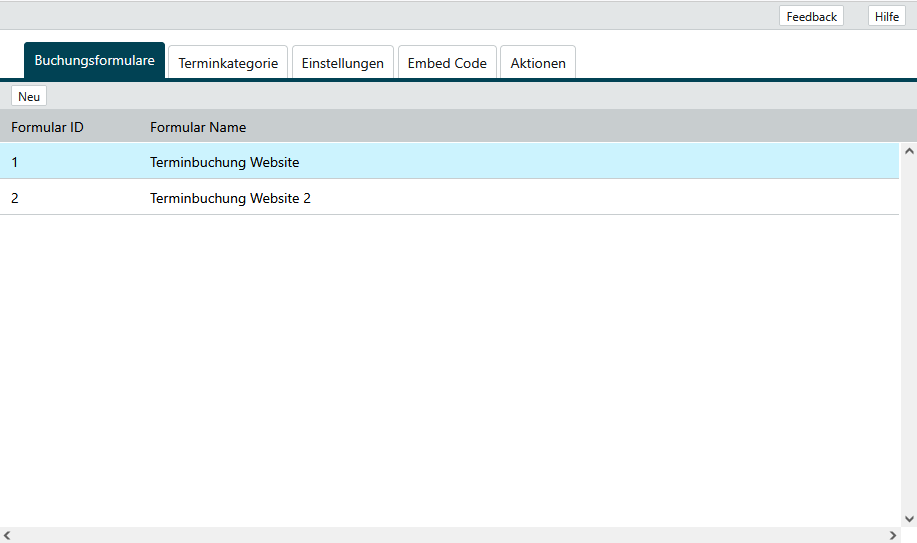 | Buchungsformular | Ist die Auswahl eines zuvor angelegten Buchungsformulars zum Buchen eines ausgewählten Termins und der für Sie erforderlichen Angaben über den Teilnehmenden. |