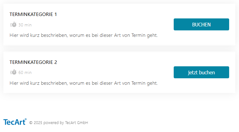 | Ort | Ist der Ort, welcher optional auf der Webseite für die Terminbuchung angegeben werden kann. Die Ausgabe erfolgt neben der Dauer des Termins. Der Ort kann auch Online o.ä. sein. Diese Ortangabe ist in diesem Fall statisch. |