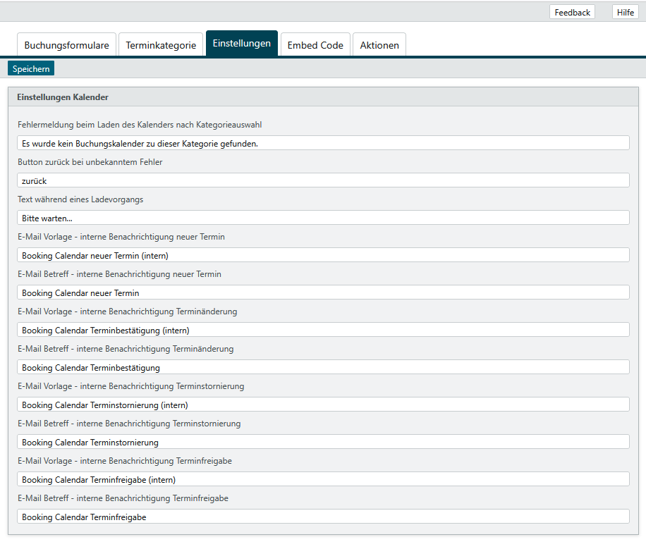 Gehen Sie im Buchungskalender auf die Registerkarte Einstellungen. In den Einstellungen werden übergreifende Einstellungen getroffen, insbesondere zu Fehlermeldungen, Button und E-Mail-Vorlagen getroffen.