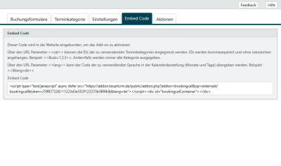 Der Buchungskalender wird als Code-Snippet auf der Webseite eingebunden. Der Code kann direkt aus dem Register Embed Code heraus kopiert werden.