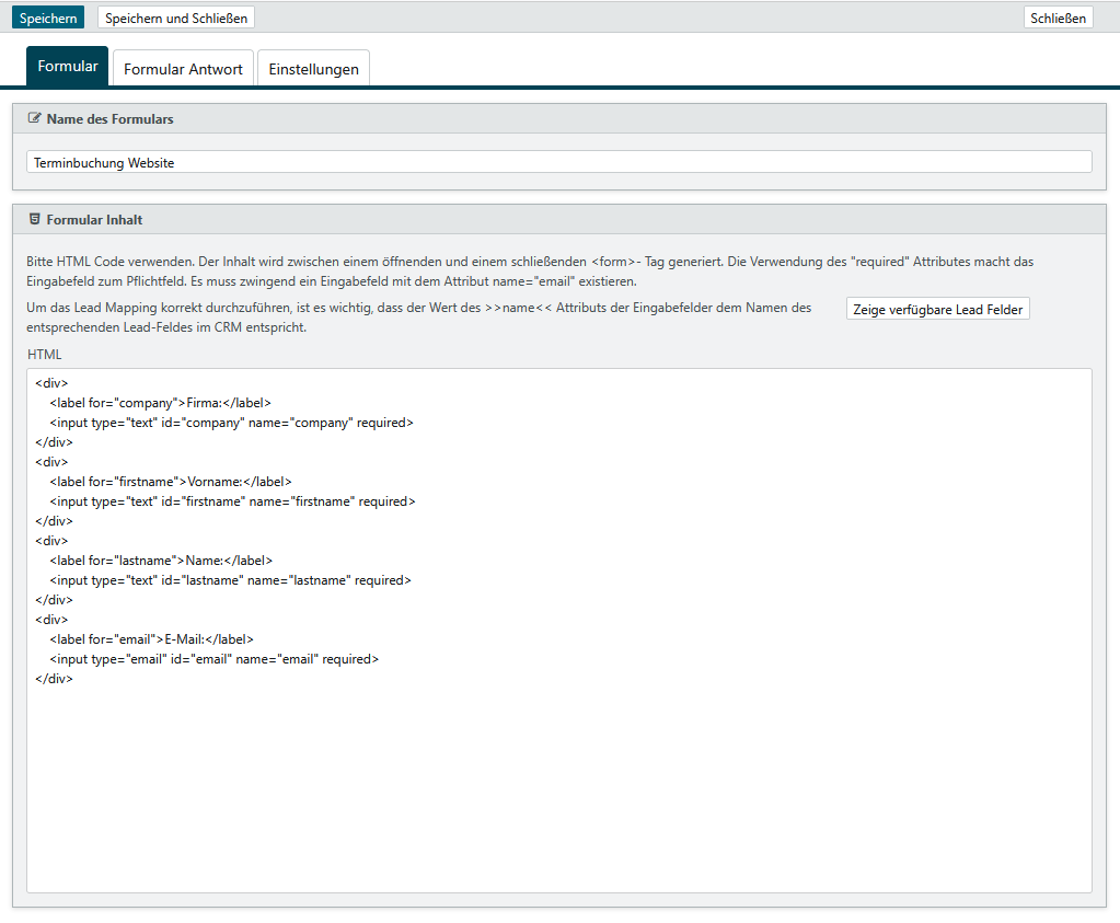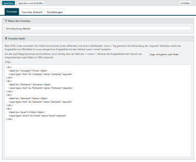 Auf der Registerkarte Formular vergeben Sie zuerst einen Namen für das Formular. Die Inhalte Ihres Formulars erstellen Sie hier mittels HTML-Code. Die Ausgabe auf der Website erfolgt automatisch innerhalb eines Tags. Sie erstellen also ausschließlich Texte und Eingabefelder.