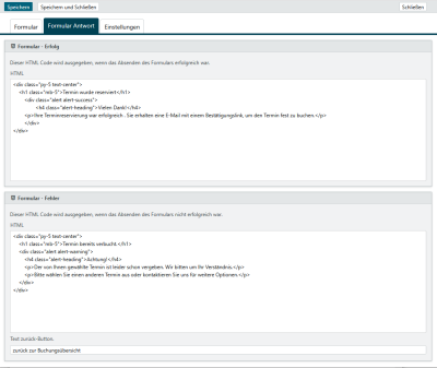 | Info Text, wenn kein Buchungsformular gefunden wurde | Text, der ausgegeben wird, wenn kein Buchungsformular angezeigt werden kann. Grund kann eine fehlende Zuordnung in den Add-on-Einstellungen der Terminkategorie oder ein generelles Fehlen von Buchungsformularen im Add-on sein. |