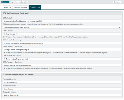 | E-Mail-Vorlage - interne Benachrichtigung Terminstornierung | Angabe der E-Mail-Vorlage, die zum Versand der E-Mail-Benachrichtigung an den CRM Kalender Besitzer verwendet werden soll. Bitte geben Sie den Namen des CRM E-Mail-Template an. |