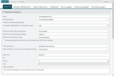 Die allgemeinen Einstellungen beinhalten vor allem relevante Einstellungen für die Kommunikation zwischen Ihrem Buchungskalender und Ihrem TecArt CRM sowie Angaben für die Ansicht auf der Webseite.