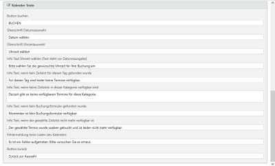 | Fehlermeldung beim Laden des Kalenders | Text, der ausgegeben wird, wenn der Kalender nicht angezeigt werden kann. Dies kann durch einen internen Fehler, Verbindungsfehler o.ä. auftreten. |