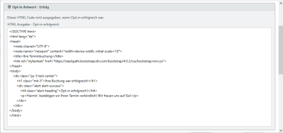 Nach dem Klick auf den Bestätigungslink in der Opt-in-E-Mail muss eine Webseite aufgerufen werden, die dem Anwender ein Feedback zurück gibt. Die Bestätigungsseiten müssen vollständige HTML-Seiten für Erfolg und Fehler sein.