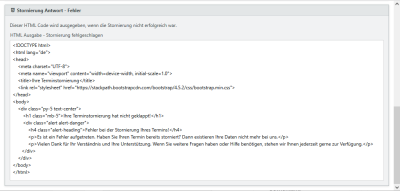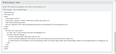 So wie bei der Opt-in-Ausgabe benötigt auch die Stornierung Webseiten, welche aufgerufen werden, um dem Anwender ein Feedback zurück zu geben. Die Bestätigungsseiten müssen vollständige HTML-Seiten für Erfolg und Fehler sein.