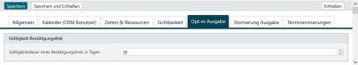 Legen sie zunächst im Feld Gültigkeit eines Bestätigungslinks in Tagen die Gültigkeit des Links fest. Hier gehen nur ganze Tage ab 1. Erfolgt keine Bestätigung innerhalb des Zeitraums, werden die Anfrage sowie der reservierte Termin automatisch gelöscht.