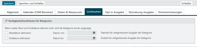Eine Terminkategorie kann ab einem bestimmten Zeitpunkt, bis zu einem bestimmten Zeitraum oder in einem vordefinierten Zeitraum angesteuert werden. Möchten Sie z.B. eine Beratung erst ab 1. Januar anbieten, weil Ihnen dort erst erfahrenes Personal zur Verfügung steht, können Sie für diese Kategorie das Startdatum aktivieren. Gleiches gilt sinngemäß für das Enddatum sowie für beide Felder.