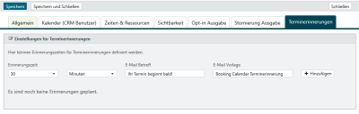 | E-Mail-Vorlage - interne Benachrichtigung neuer Termin | Angabe der E-Mail-Vorlage, die zum Versand der E-Mail-Benachrichtigung an den CRM Kalender Besitzer verwendet werden soll. Bitte geben Sie den Namen des CRM E-Mail-Template an. |