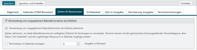 Wählen Sie die Option Verwendung von vorgegebenen Kalenderterminen als Zeitslots aktivieren, werden ausschließlich vordefinierte Kalendertermine als verfügbare Zeitslots für Buchungen verwendet. Dabei ist es erforderlich, dass Sie Termine im TecArt mit der gewünschten Buchungskalender-Terminkategorie und dem Status mit Vorbehalt im Kalender anlegen. Alle folgenden Termineinstellungen werden ausgeblendet und auch nicht bei der Zeitslotberechnung berücksichtigt.