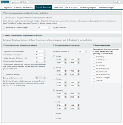 In diesem Bereich machen Sie Angaben zu Geschäftsregeln wie Arbeitszeiten, Pausen, Vor- und Nachbearbeitungszeiten für Zeitslots der gewählten Terminkategorie.