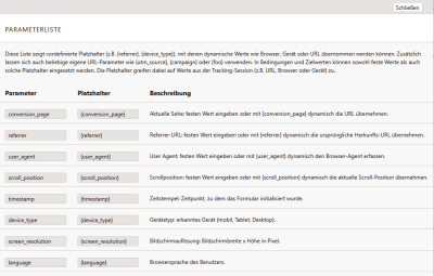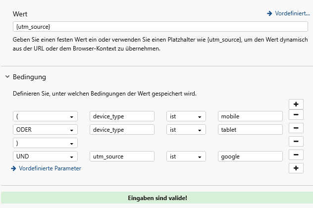 Bei der Definition von Zielwerten oder Bedingungen können Sie entweder einen festen Wert direkt eingeben (z.B. google_mobile, newsletter, Ja) oder einen dynamischen Wert aus der URL oder Browser-Daten verwenden. Dafür schreiben Sie den Parameter in geschweifte Klammern {}, z.B. {utm_source}, {device_type}, {referrer}. Diese Werte werden dann zur Laufzeit automatisch aus dem aktuellen Formularabruf ausgelesen.