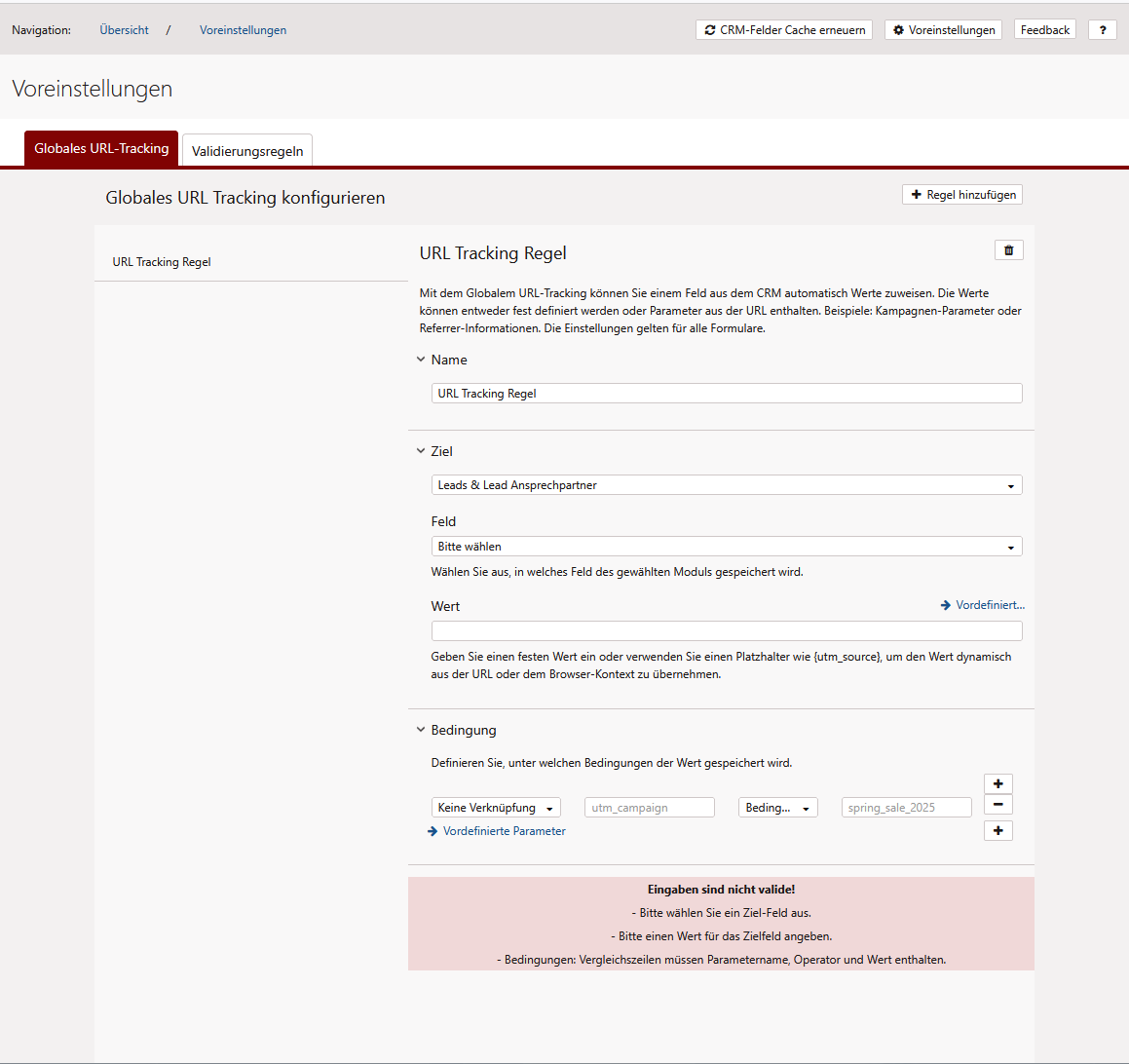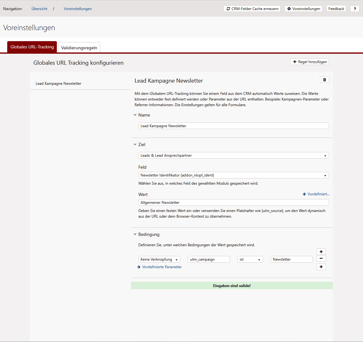 Über den Button gelangen Sie zur globalen Konfigurationsseite des Add-ons, auf der unter anderem die Validierungsregeln verwaltet werden oder das globales URL-Tracking eingerichtet wird.
