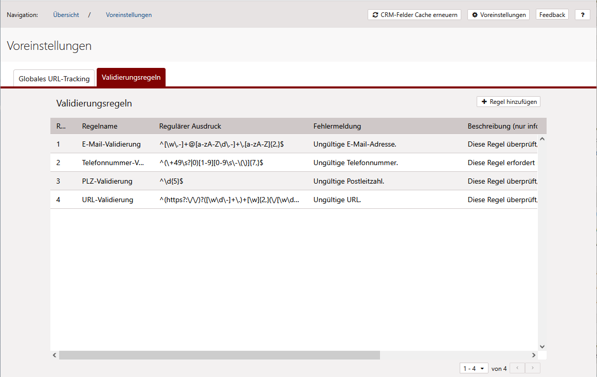 Auf der Registerseite Validierungsregeln können zentrale Regex- und Pflichtfeldvorlagen verwaltet werden, die in Formularen zur Eingabeverifizierung genutzt werden können. Mit der Installation des Add-ons werden bereits vier Regeln ausgeliefert, welche zur Anwendung kommen können. Die Validierungsregeln sind vor allem hilfreich, um Formulareingaben wie E-Mail-Adressen, Telefonnummern, Postleitzahlen oder URLs automatisch zu prüfen und nur gültige Eingaben zu akzeptieren.