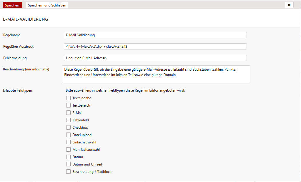 Über die Optionsfelder Erlaubte Feldtypen können Sie die Verwendung der Regeln weiter einschränken. Einige Regeln ergeben in verschiedenen Feldtypen keinen Sinn. So würde die Regel mit der Postleizahl mindestens in den Feldtypen Checkbox, Dateiupload oder auch Datum sowie Datum und Uhrzeit keinen Sinn ergeben. Also warum dort anzeigen und auswählbar machen?